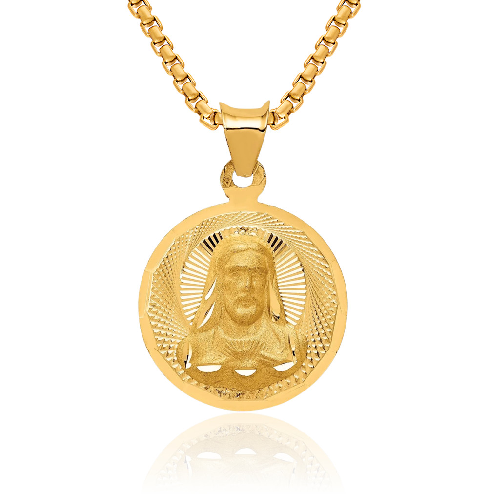 14K Solid Yellow Gold Sacred Heart of Jesus Round Necklace