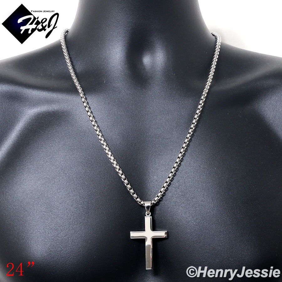 18″-40″MEN Stainless Steel 4mm Silver Box Link Necklace Plain Cross Pendant*P64