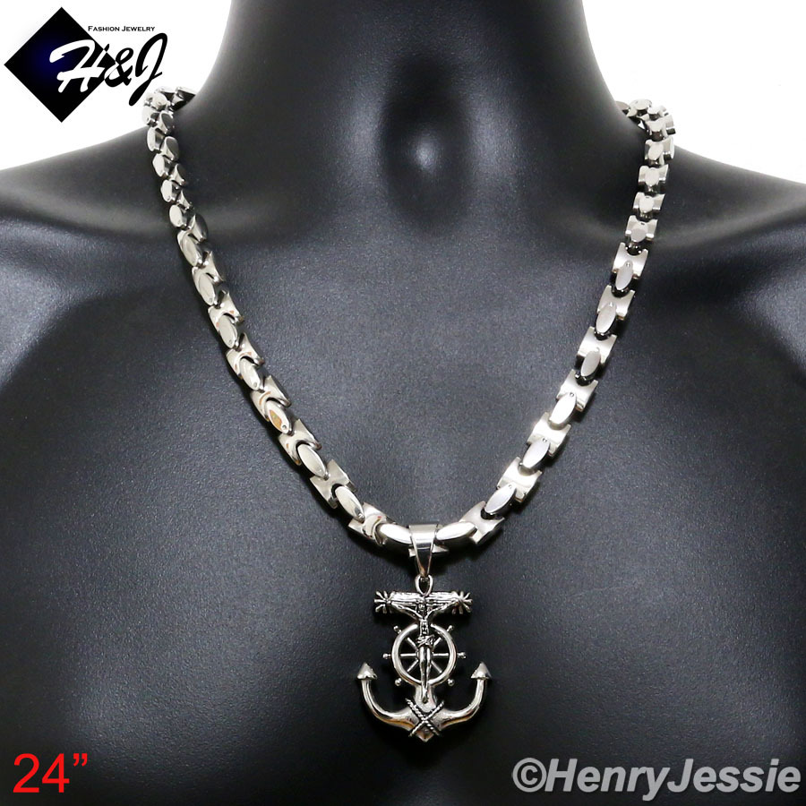 18-40″Stainless Steel 8mm Silver Interlock Bone Necklace Anchor Cross Pendant*58