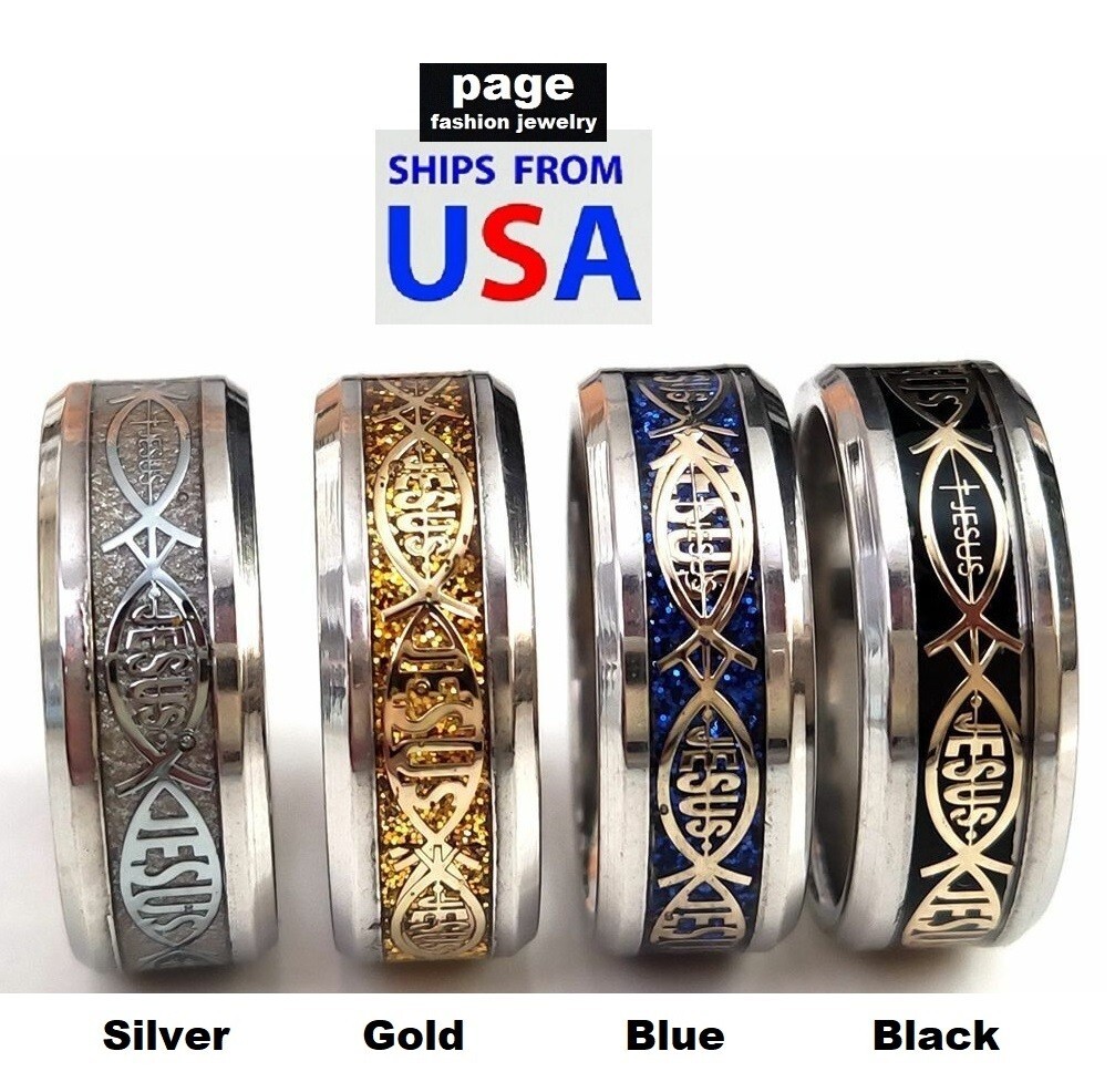 1pc Jesus Fish Christian Men/Women Stainless Steel 8mm Band Ring Size 7-11.5