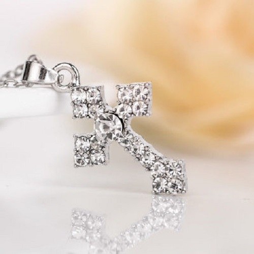 AUSTRIAN CRYSTAL RELIGIOUS CROSS SILVER 20″ NECKLACE PENDANT female #C116