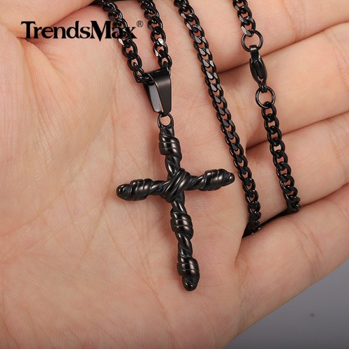 Black Stainless Steel Religious Cross Pendant Charm Necklace Curb Chain Jewelry