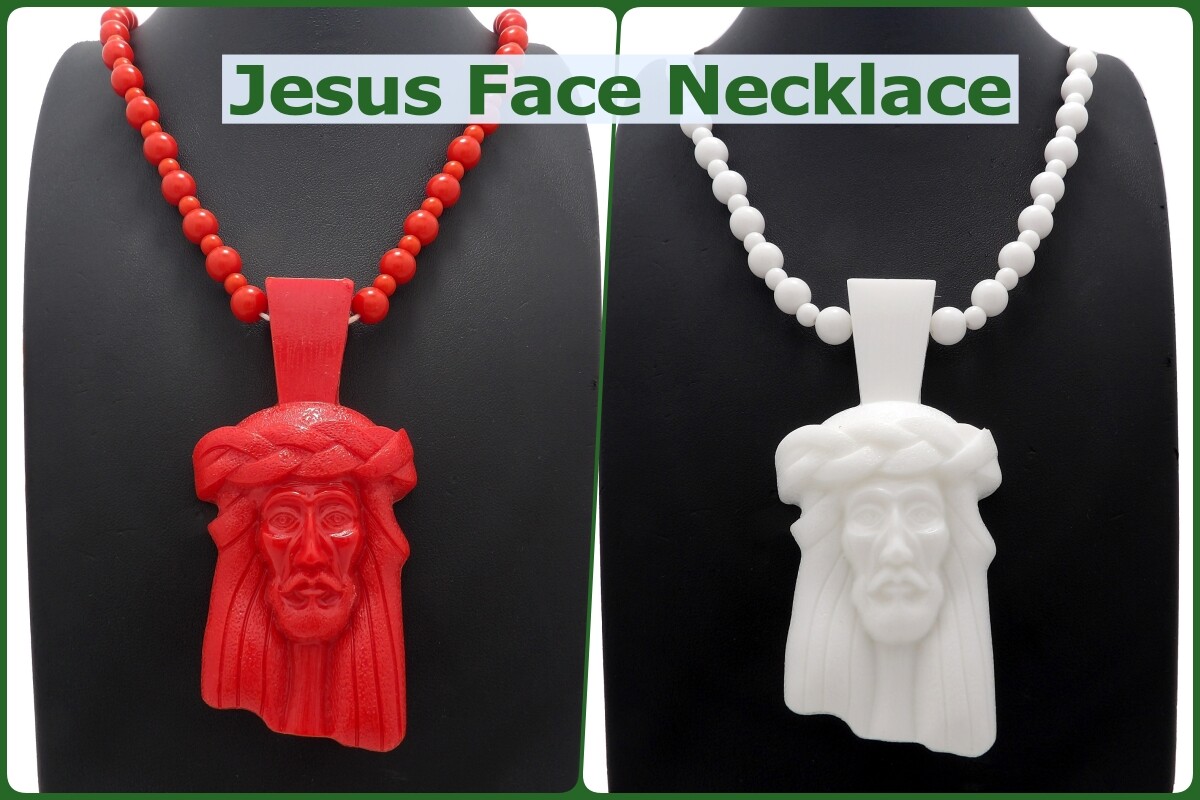 Blessed Jesus Face Pendant 8mm 36″ Plastic Bead Necklace in Red, White Color GA4