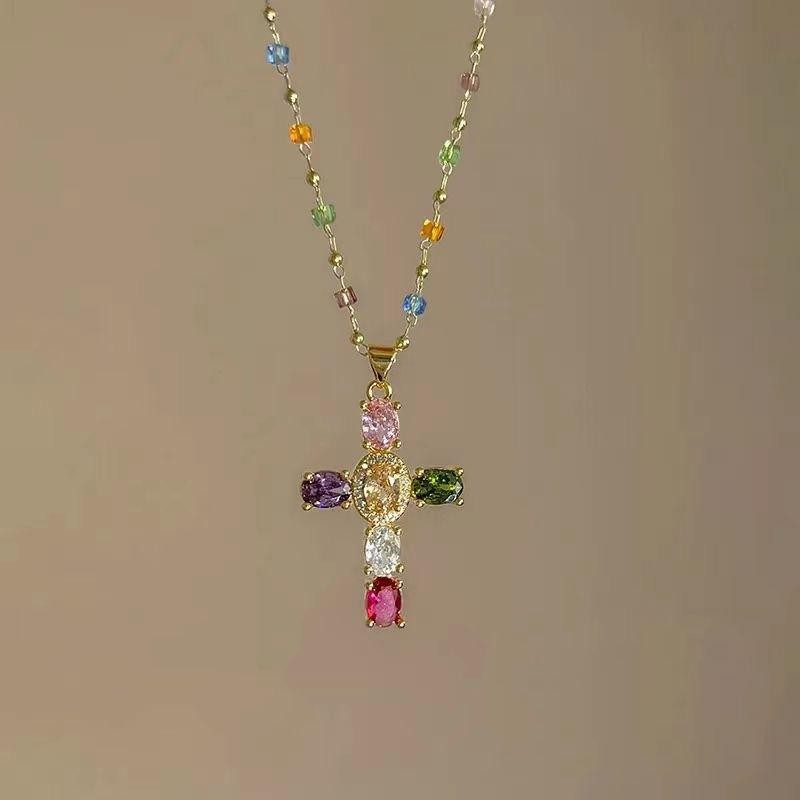 Colorful Zircon Cross Pendant Necklace Stainless Steel Religious Jewelry Gift