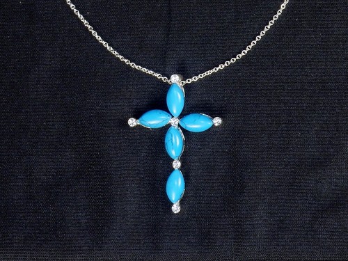 Cross Necklace ~ Winter Blue Faux Gemstones, 6 CZs, Chrome Frame, 18” Chain, Box