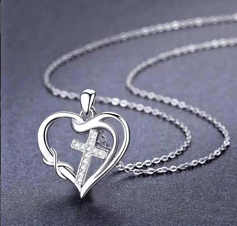 FAITH INFINITY HEART CROSS Pendant 20″ Plated 925 Sterling Silver Necklace Women