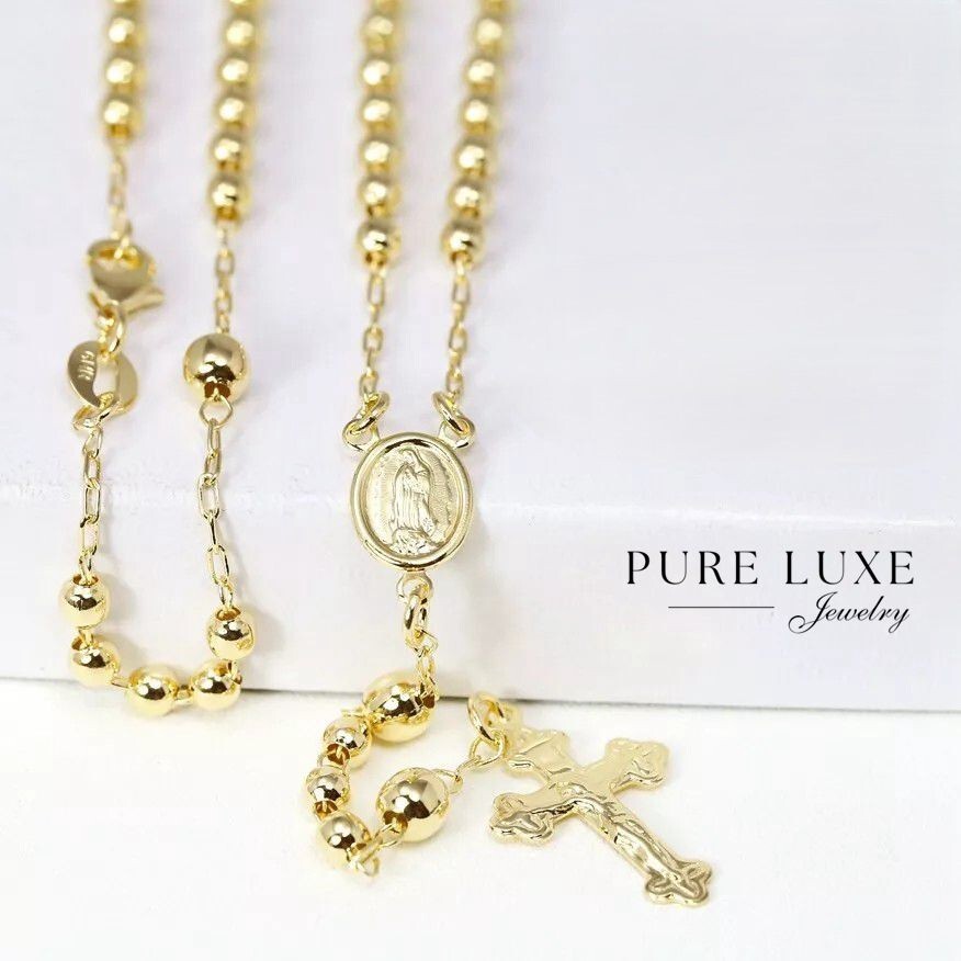 Gift 16″ Gold Sterling Silver Rosary VIRGIN MARY JESUS CROSS Necklace + Box