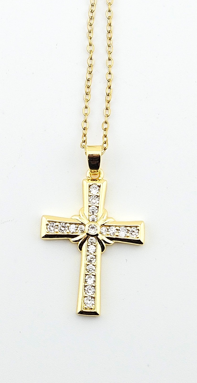 Gold Tone Cross Necklace With Clear Crystals J17-3944