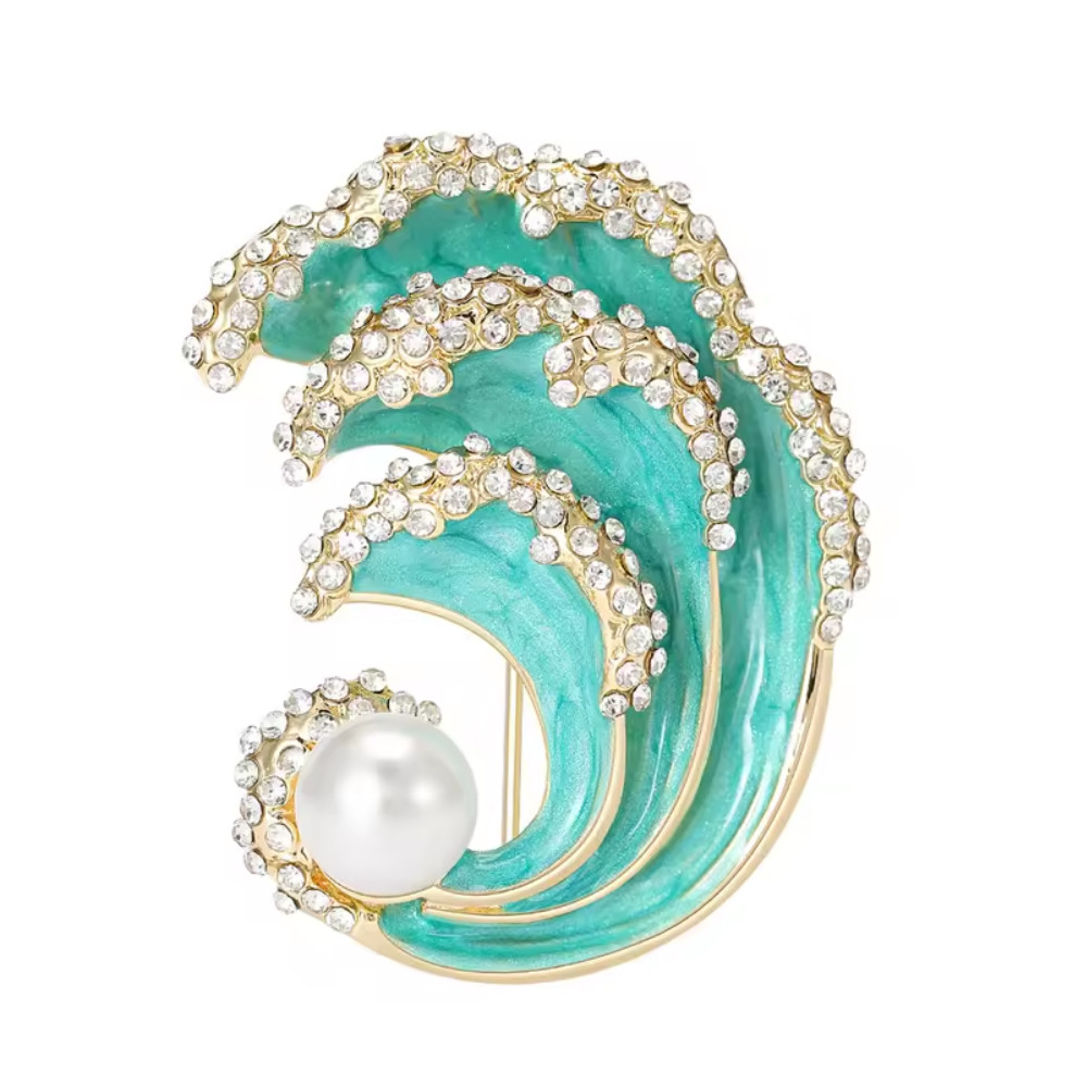 Gold Tone Ocean Wave Brooch – Pearl Rhinestone Nautical Pin, Summer Jewelry Gift