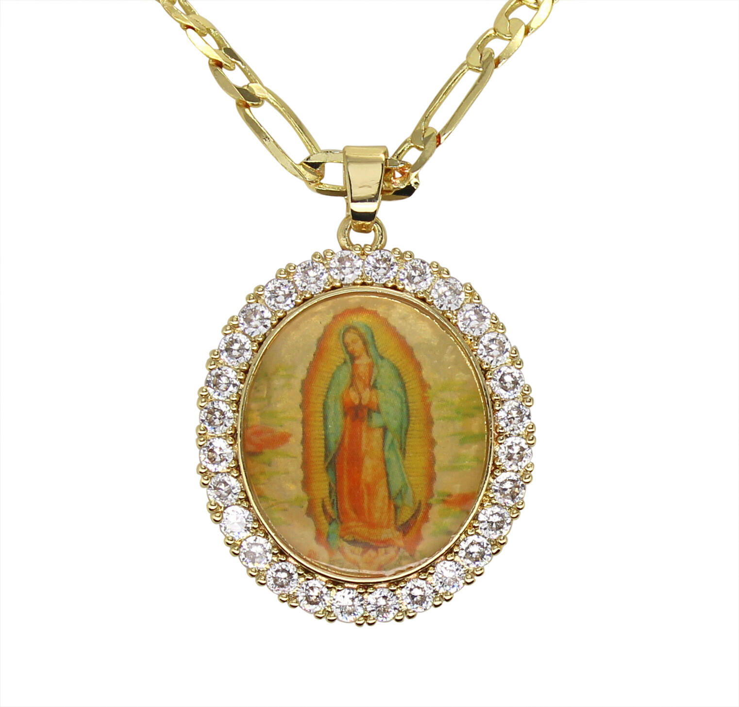 Guadalupe 14k Gold Plated Charm Oval CZ Pendant 4mm 20″ Figaro Necklace Chain