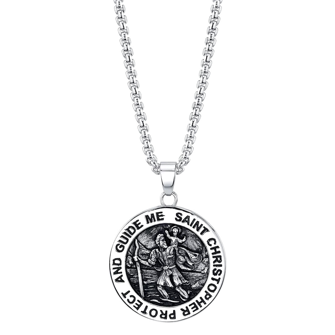 He Rocks “Saint Christopher” Coin Pendant Necklace in Stainless Steel, 24″ Chain