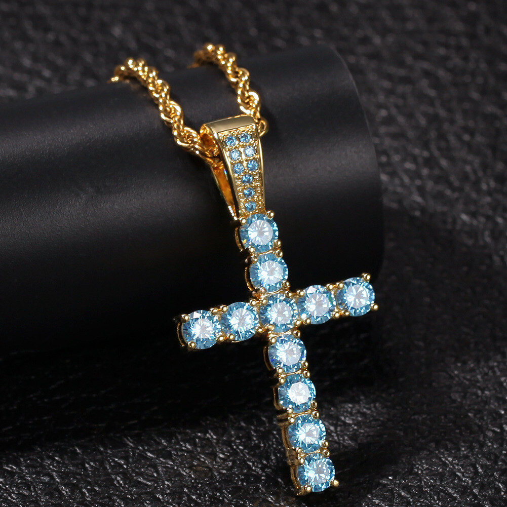 Hip Hop Colorful Zircon Cross Pendant Necklace Men Women Lover Religious Jewelry