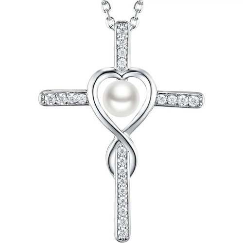 Infinity Heart Cross Necklace with Pearl – Silver Christian Jewelry