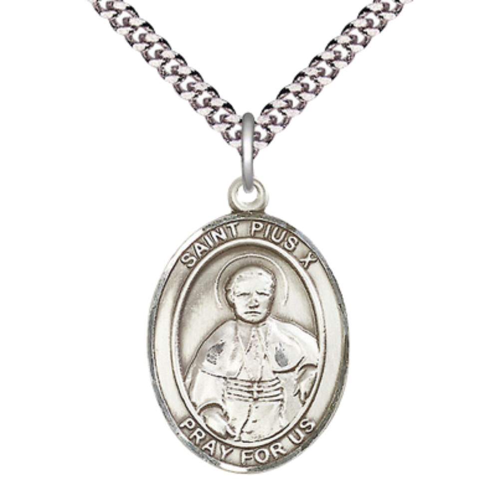 Large Pewter Saint Pius X Medal Pendant 24″ Lobster Claw Chain Catholic Necklace