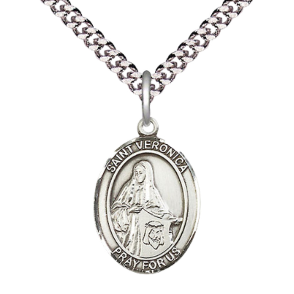 Medium Sterling Silver Saint Veronica Medal 24″ Lobster Claw Chain Necklace