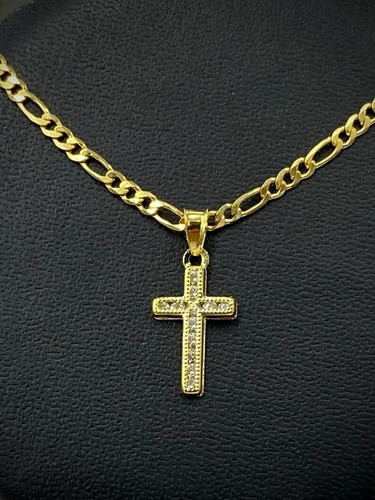 Men Women Cross CZ Pendant 14k Gold Filled Figaro Chain Necklace Baby Kids 17×10