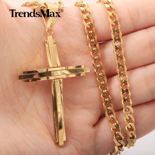 Mens Gold Plated Stainless Steel Cross Pendant Necklace 18-30″ Cuban Curb Chain