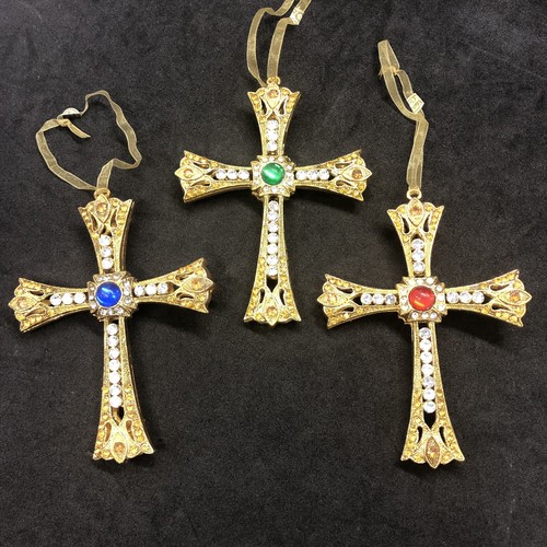 Ornate Gold Jeweled Religious Cross Christmas Ornament Rhinestone Metal 3 Pc Box
