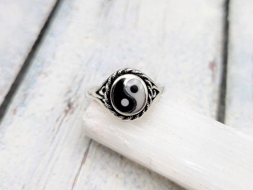 Oxidized 925 Sterling Silver Yin Yang Ring: Black Agate and Mother of Pearl
