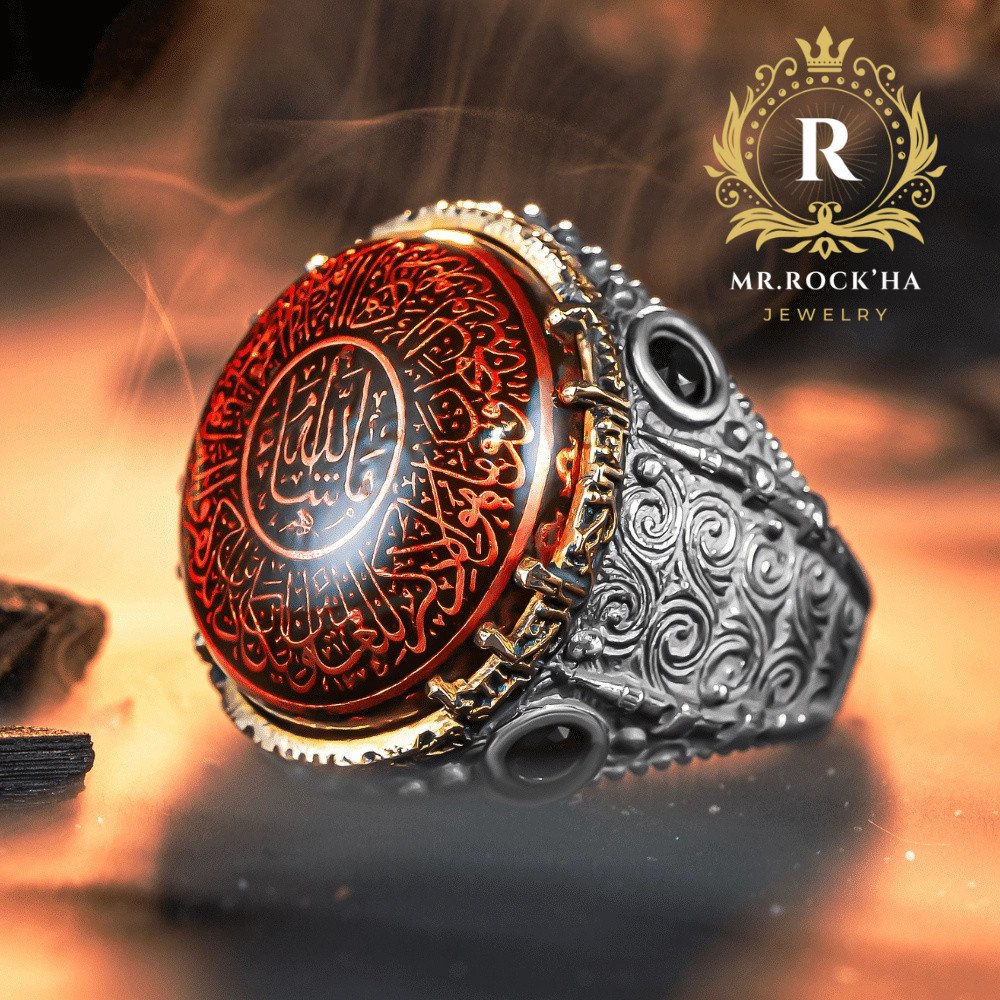 Quran Verse of Protection Written,Engraving Art,Red Amber,925 Silver Men’s Ring