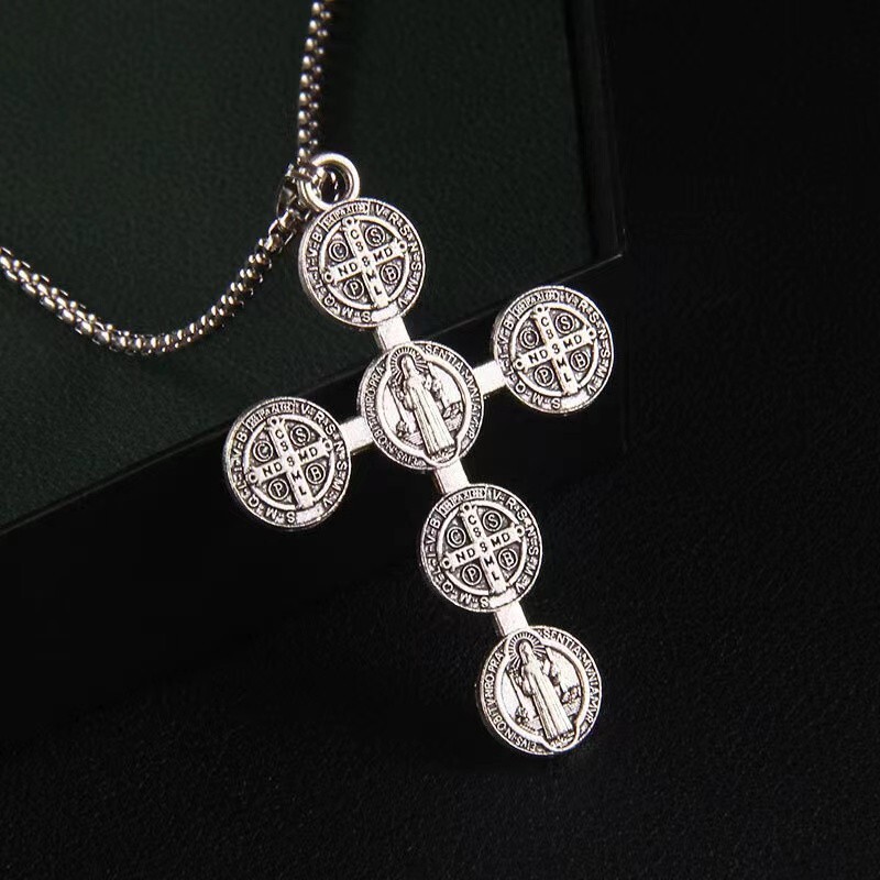Silver Saint St Benedict Medal Cross Pendant Necklace Exorcism Jewelry Men Women