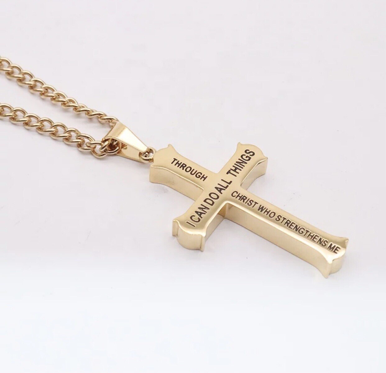 Stainless Steel Gold Philippians 4:13 Cross and 24 Inch Chain