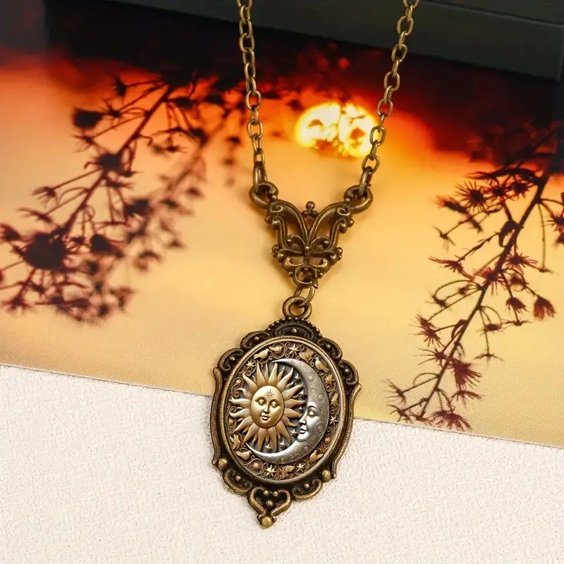 Sun Moon Gothic Bronze Necklace Jewelry Vintage Look Oval Pendant