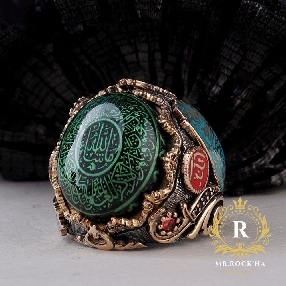 Ayet El Kursi,Quran Verse Written Engraving,Green Amber,925 K Silver Men’s Ring