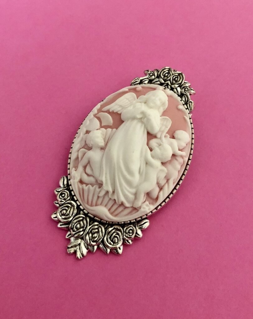 Vtg Guardian Angel w/ Cherub Babies White/Pink Cameo Brooch Pin, Antiqued Silver
