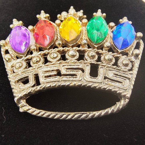 VTG Jesus Crown Brooch Pin Multicolor Rhinestone Gold Tone Filigree Religious