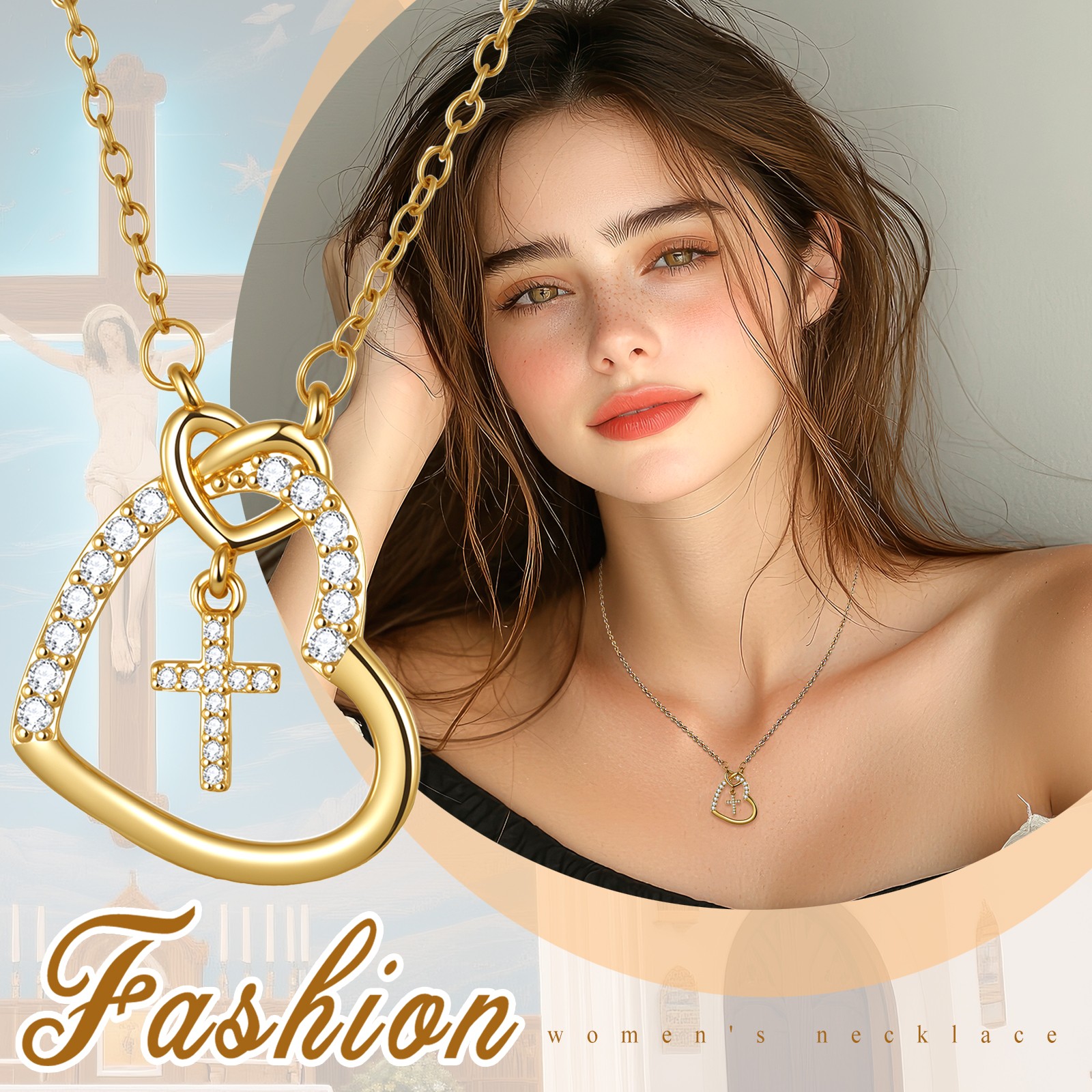 Women’s Exquisite Cross&Heart Pendant Necklace Religious Faith Copper&CZ Chain